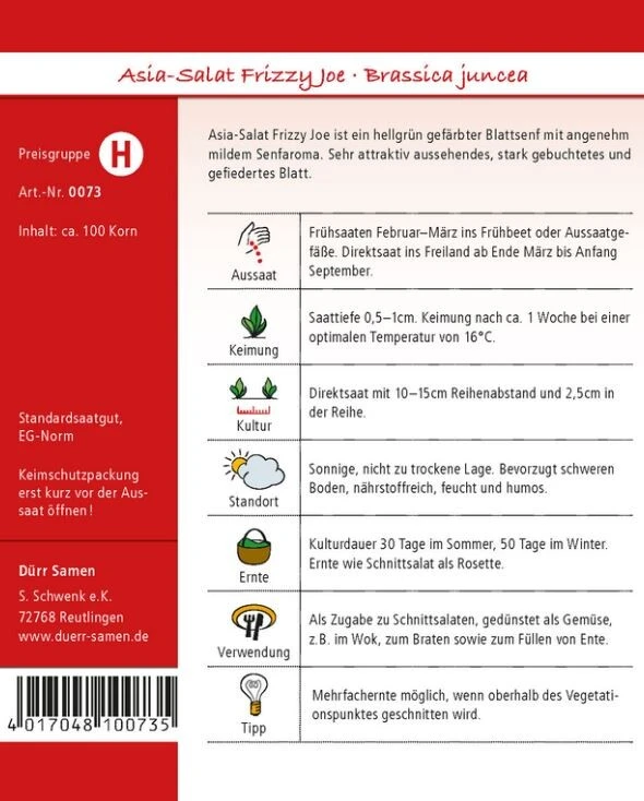 Asia-Salat Frizzy Joe ist ein hellgrün gefärbter Blattsenf mit angenehm mildem Senfaroma.