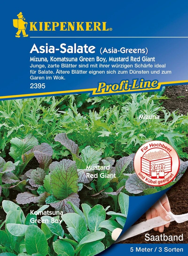Die Asia-Salate aus dem Profi-Line-Programm von Kiepenkerl bestechen mit ihrer würzigen Schärfe und sind vor allem in der leichten, kalorienarmen Küche sehr beliebt. In diesem Mix ist Saatgut für die Sorten ‚Mizuna‘, ‚Komatsuna Green Boy‘ und ‚Mustard Red Giant enthalten – und zwar auf einem Saatband, dank welchem die Aussaat nicht nur spielend leicht von der Hand geht, sondern auch später das Vereinzeln zu dicht stehender Salatpflanzen entfällt! Von April bis Anfang August kann die Aussaat im Freiland, Hochbeet oder Kübel erfolgen. Dazu einfach das Saatband auf die passende Länge schneiden, auslegen, mit Erde bedecken und kontinuierlich feucht halten. Etwa 5 bis 7 Wochen nach der Aussaat können die jungen, zarten Blätter geerntet werden.
