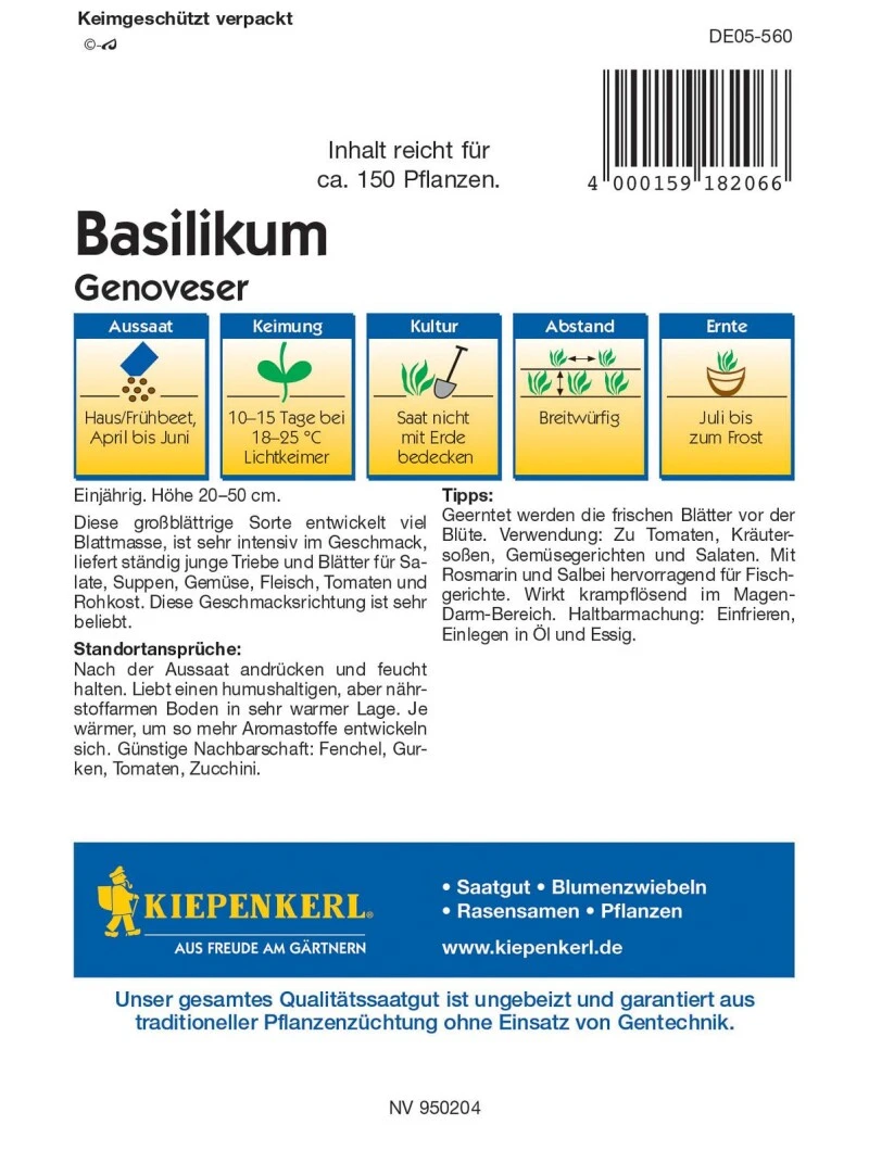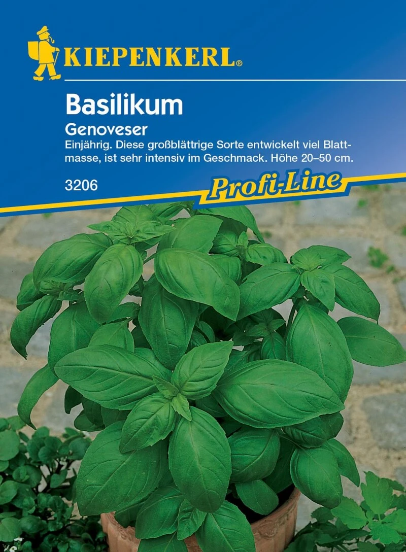 Das Basilikum ‚Genoveser‘ ist eine großblättrige, einjährige Sorte, die viel Blattmasse entwickelt und sehr intensiv im Geschmack ist. Im Zeitraum von Juli bis zum Frost liefert dieses Profi-Line-Basilikum von Kiepenkerl ständig junge Triebe und Blätter. Mit ihnen können Salate, Suppen, Gemüse, Fleisch, Tomaten und Rohkost raffiniert gewürzt werden. In der Heilkunde wird dem Basilikum eine krampflösende Wirkung im Magen-Darm-Bereich nachgesagt. Wurde einmal mehr geerntet, als in der Küche gebraucht wurde, lassen sich die Blätter durch Einfrieren oder Einlegen in Öl und Essig haltbar machen.