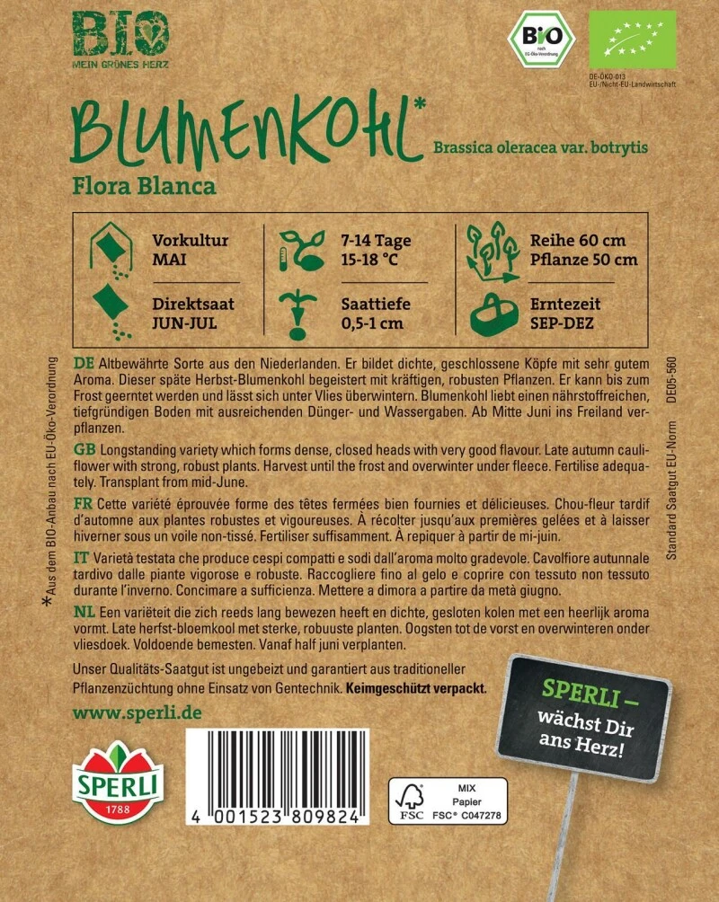 Bei diesem BIO-Blumenkohl handelt es sich um eine altbewährte Sorte aus den Niederlanden. Er bildet dichte, geschlossene Köpfe mit sehr gutem Aroma. Dieser späte Herbstblumenkohl wird dich mit seinen kräftigen, robusten Pflanzen begeistern. Er kann bis zum Frost geerntet werden und lässt sich unter Vlies sogar überwintern. Damit der Blumenkohl gut gedeihen kann, benötigt er nährstoffreichen, tiefgründigen Boden sowie ausreichende Dünger- und Wassergaben. Die Vorkultur beginnt im Mai und ab Mitte Juni solltest Du den Blumenkohl ins Freiland verpflanzen.