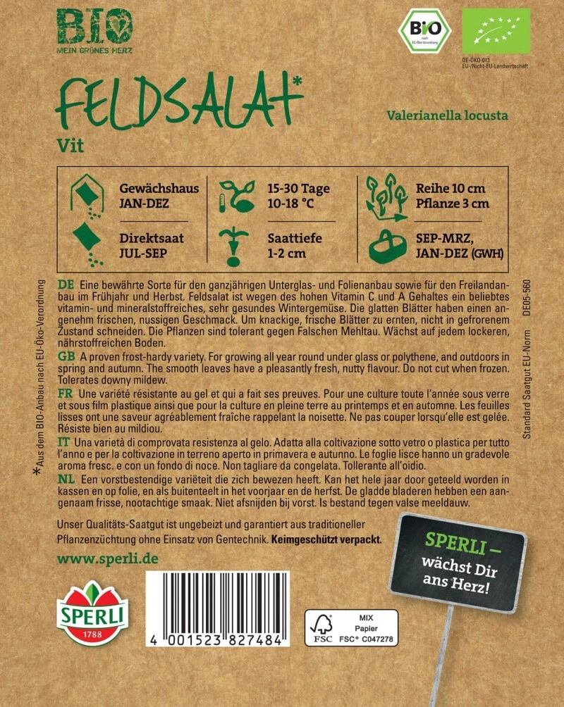 Mit dem BIO-Feldsalat ‚Vit‘ von SPERLI wächst nicht nur gesundes Gemüse im Garten oder Gewächshaus. Das Saatgut ist zudem auch aus biologisch angebauten Mutterpflanzen gewonnen und genügt höchsten Ansprüchen. ‚Vit‘ ist eine beliebte und bewährte Sorte für den ganzjährigen Unterglas- und Folienanbau. Im Freiland ist eine Aussaat von Juli bis September möglich. Ein lockerer, nährstoffreicher Boden ohne Unkraut ist ideal für eine erfolgreiche Kultur. Gegen den Falschen Mehltau ist ‚Vit‘ tolerant, was ihn zu einer sehr gelingsicheren Sorte macht.