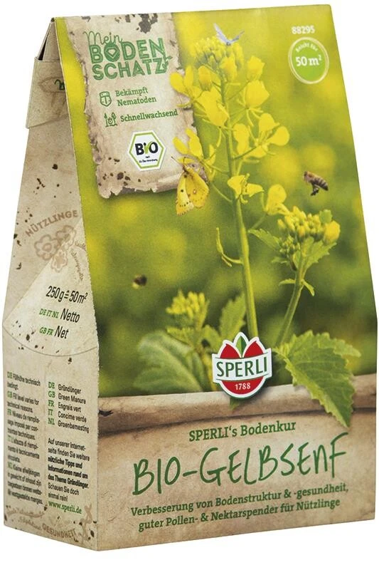 SPERLI’s BIO-Gelbsenf ist ein einjähriges Kreuzblütengewächs, das als Gründünger angebaut zur natürlichen Nährstoffanreicherung und Bodenlockerung beiträgt. Besonders die schnelle Entwicklung der Pflanze und die spätsaatverträglichkeit machen die Pflanze sehr Interessant. Des weiteren vermindet der dichte Pflanzenbestand das Aufkommen von Unkräutern und schützt den Boden vor Austrocknung, Verschlämmung und Nährstoffauswaschungen. Die in ihm enthaltenden Senföle wirken gegen Nematoden und beeinflussen positiv das Bakterien- und Pilzleben. Gelbsenf darf niemals vor oder nach Kulturen von Kreuzblütlern (z.B. Kohl) erfolgen. Es sollte eine Anbaupause von mind. 4 Jahren eingehalten werden. Guter Pollen- & Nektarspender für Nützlinge.