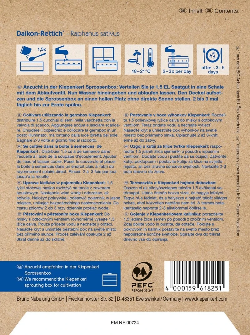 Rettich-Sprossen haben einen leicht scharfen Geschmack, der sich bereits in ganz kleinen Mengen entfaltet. Sie eignen sich hervorragend zur Zubereitung von Salaten und zur Verfeinerung von Fleisch-, Reis-, Mehl-, Eier- und Käsegerichten. 2- bis 3-Mal täglich bis zur Ernte spülen. Verzehrfertig in 3 bis 5 Tagen.