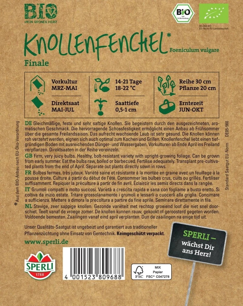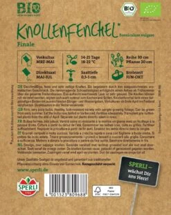 Der BIO-Knollenfenchel ‚Finale‘ von SPERLI ist eine schossfeste Sorte, die feste, saftige Knollen mit einem sehr aromatischen Geschmack entwickelt. Die Aussaat der BIO-Samen ist von März bis Juli möglich, zunächst als Vorkultur und ab Mai auch als Direktsaat. Ein tiefgründiger Boden und sonniger Standort sowie ausreichende Wasser- und Düngergaben sorgen für optimale Anbaubedingungen. Wenn die Knollen im Zeitraum von Juni bis Oktober erntereif sind, eignen sie sich sowohl für den Rohverzehr als auch zum Kochen und Grillen. Selbst das aufrecht wachsende Laub kann gegessen werden und ist sehr gesund.