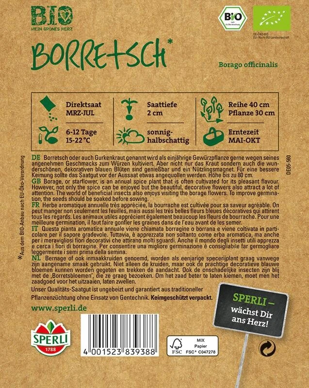 Bei dem BIO-Borretsch von SPERLI handelt es sich zwar in der erster Linie um ein einjähriges Würzkraut, das auch als Gurkenkraut bekannt ist und mit dem sich zum Beispiel Salate und Suppen wunderbar aromatisch verfeinern lassen. Es bildet aber auch zierliche blaue Blüten in Sternform aus, die ebenfalls essbar sind und sogar im Blumenbeet eine gute Figur machen! Der BIO-Borretsch erreicht an sonnigen oder halbschattigen Standorten eine Wuchshöhe von bis zu 80 cm. Ausgesät werden können die Samen ins Freiland oder in Kübeln in der Zeit von März bis Juli. Eine Ernte der Blätter und Blüten ist bei früher Aussaat von Mai bis Oktober möglich. Werden die Blüten nicht mit geerntet, sind sie übrigens ein echter Nützlingsmagnet.