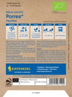 Der winterharte BIO-Porree ‚Hannibal‘ ist ein bekanntes und bewährtes Herbst- und Wintergemüse in hervorragender Bioqualität. Diese mittelspäte Sorte aus dem Profi-Line-Sortiment bringt glatte, weiße Schäfte in beträchtlicher Länge hervor, die einen delikaten mild-würzigen Geschmack haben. Doch auch die dickfleischigen Blätter in dunklem Blaugrün sind äußerst schmackhaft. Von November bis Mai können Sie den zuverlässigen BIO-Porree ernten und genießen, womit sie eine besonders lange Ernteperiode haben.