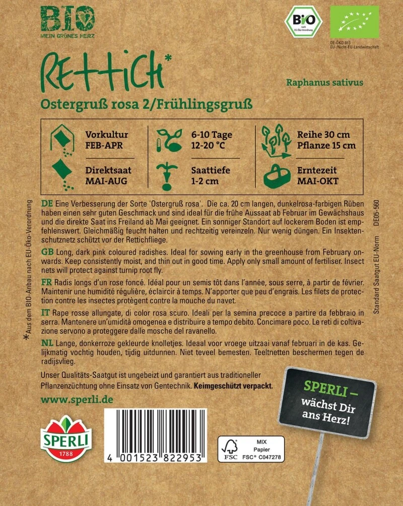 Der BIO-Rettich ‚Ostergruß rosa 2/Frühlingsgruß‘ ist eine weiterentwickelte Züchtung der Sorte ‚Ostergruß rosa‘. Die ca. 20 cm langen, dunkelrosa-farbigen Rüben haben einen sehr guten Geschmack und sind ideal für die frühe Aussaat ab Februar im Gewächshaus und die direkte Saat ins Freiland ab Mai geeignet. Ein sonniger Standort auf lockerem Boden hat sich bewährt, um von Mai bis Oktober in den Genuss der optisch ansprechenden Wurzeln zu kommen. Wichtig ist auch, die Pflanzen stets gleichmäßig feucht zu halten und rechtzeitig zu vereinzeln. Vor der Rettichfliege schützt ein Insektenschutznetz.