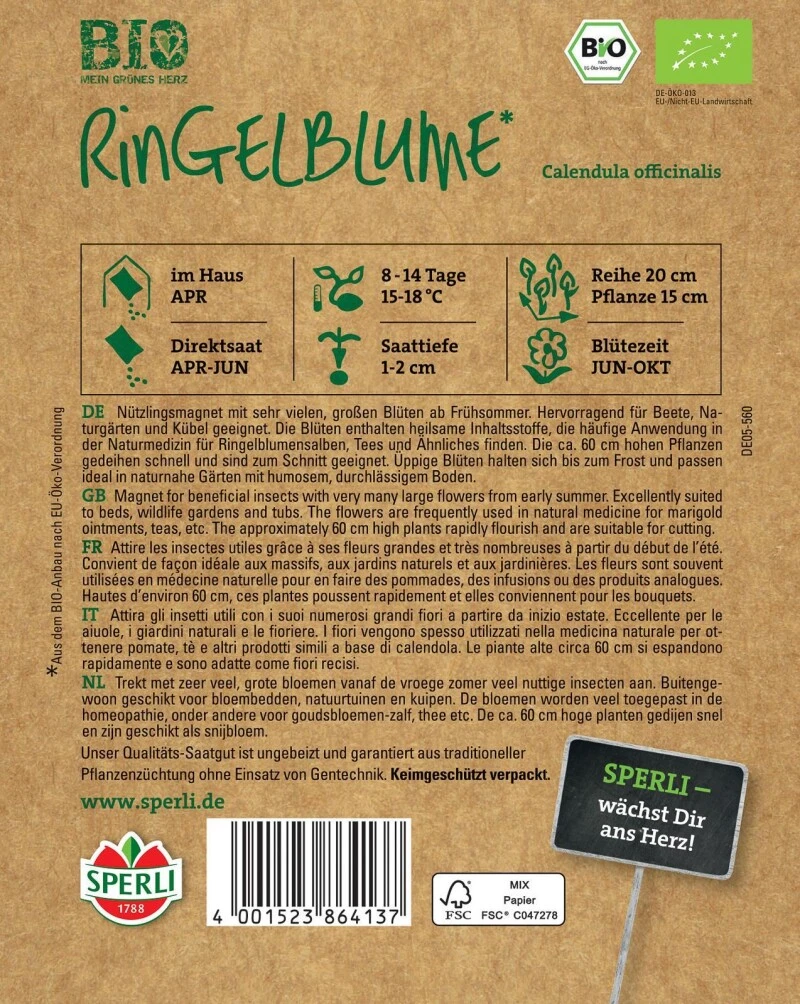 Nützlingsmagnet mit sehr vielen, großen Blüten ab Frühsommer. Hervorragend für Beete, Naturgärten und Kübel geeignet. Die Blüten enthalten heilsame Inhaltsstoffe, die häufige Anwendung in der Naturmedizin für Ringelblumensalben, Tees und Ähnliches finden. Die ca. 60 cm hohen Pflanzen gedeihen schnell und sind zum Schnitt geeignet. Üppige Blüten halten sich bis zum Frost und passen ideal in naturnahe Gärten mit humosem, durchlässigem Boden.