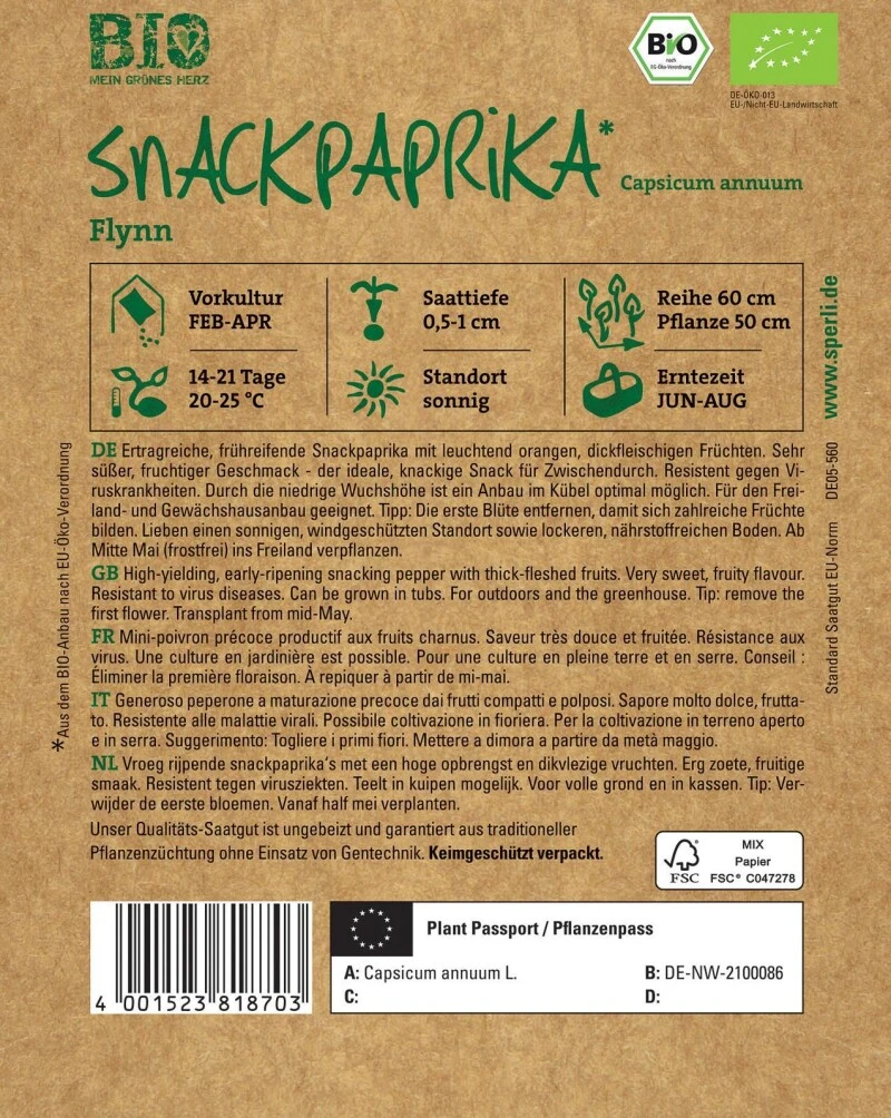 Die BIO-Snackpaprika ‚Flynn‘ von SPERLI ist eine frühe, robuste Naschsorte. Die leuchtend orangen Früchte sind dickfleischig und dank ihres sehr süßen, fruchtigen Geschmacks der ideale Snack für Zwischendurch. Die Pflanzen sind von Natur aus resistent gegen typische Viruskrankheiten, was den Anbauerfolg sichert. Durch die niedrige Wuchshöhe können die Pflanzen im Kübel herangezogen werden, sind aber auch für den Freiland- und Gewächshausanbau geeignet. Im Juli und August sind die Früchte erntereif und können direkt von den Pflanzen genascht werden.