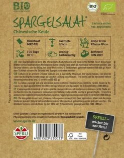 Der BIO-Spargelsalat ‚Chinesische Keule‘ gilt als wahre Rarität in deutschen Gärten. Die Strünke des Spargelsalates können vor der Blüte geerntet und gekocht werden. In der Zubereitung ähneln sie dann, wie der Name bereits sagt, dem Spargel. Doch nicht nur das: Auch die jungen Blätter eignen sich für den Verzehr. Dazu einfach die Blätter im Rosettenstadium abpflücken und roh oder gekocht in den Salat geben – schon ist ein perfektes Sommergericht kreiert! Der BIO-Spargelsalat von SPERLI ist neben dem Freilandanbau auch für die Kultur in Kübeln geeignet.