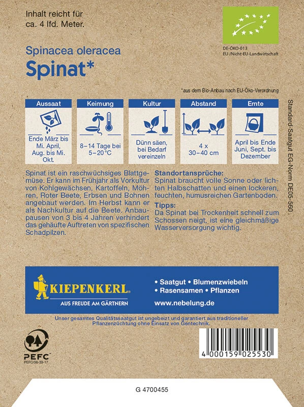 Dieser schnell wachsende BIO Spinat ist eine wahre Spitzenzüchtung! Er bringt einen besonders hohen Ertrag mit dunkelgrünen, appetitlich glänzenden Blättern. Sie schmecken würzig und können dadurch für viele köstliche Gerichte verwendet werden. Die Blätter stehen aufrecht, sodass Sie sie leicht und sauber ernten können. Eine Ernte ist von April bis Ende Juni oder von September bis Dezember möglich. Durch eine weitreichende Resistenz gegen den Falschen Mehltau ist die Sorte besonders sicher im Anbau. Zudem ist diese F1-Hybride für Nachkulturen im Herbst gut geeignet.