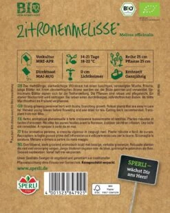Die BIO-Zitronenmelisse von SPERLI ist ein mehrjähriges Würzkraut mit einem buschigen, verzweigten, kräftigen Wuchs. Die Samen werden entweder im März und April im Haus ausgesät und vorkultiviert oder von Mai bis August direkt im Freiland ausgebracht. Vor der Blüte werden die jungen, frischen Blätter geerntet, welche mit einem zitronenfrischen Aroma in der Küche für Begeisterung sorgen. Sie können auch getrocknet und für die Teeherstellung verwendet werden. Die mehrjährigen Pflanzen sind robust und pflegeleicht und vertragen auch starke Rückschnitte. Sie lieben einen durchlässigen, nährstoffreichen Boden und eignen sich ebenfalls für Kultur in Pflanzgefäßen.