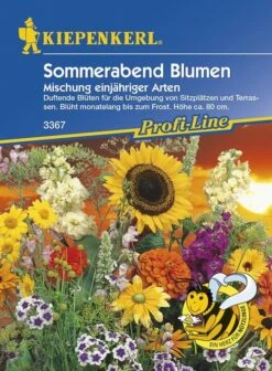 Die Blumenmischung „Sommerabend Blumen“ geizt nicht mit duftenden Blüten, die ab Mitte Juni bis zum Frost blühen. Sie eignet sich hervorragend, um Sitzplätze und Terrassen zu dekorieren. Gegen Abend verströmen die blühfreudigen, bis zu 80 cm hohen Blumen ihren lieblich-angenehmen Duft, welchem viele nützliche Insekten, hier insbesondere Schmetterlinge, nicht widerstehen können. Auch in größeren Gefäßen gedeiht diese Mischung aus dem Profi-Line-Programm problemlos. Darüber hinaus können die Blumen geschnitten und für lange Zeit in die Vase gestellt werden.