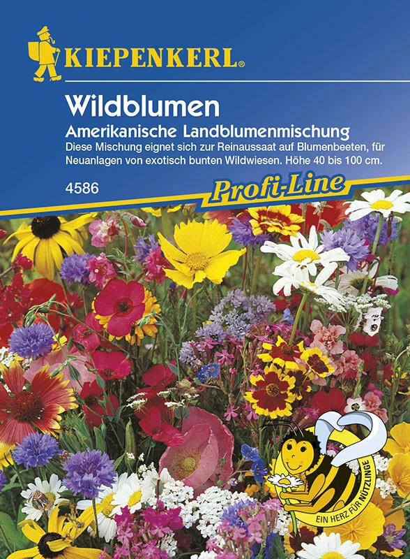 Die Blumenmischung „Wildblumen Amerikanische Landblumen“ eignet sich zur Reinaussaat auf Blumenbeeten und für Neuanlagen von exotisch bunten Wildwiesen. Aus der weiten, unverfälschten Natur Nordamerikas und Kaliforniens sind hier Wildarten zusammengestellt, die in unserem Klima eine bunte Blütenpracht entwickeln. Kalifornischer Mohn, Mädchenauge, Sonnenhut und mehrjährige Stauden prägen diese Profi-Line-Mischung von Kiepenkerl und blühen ab Juni. Schmetterlinge, Bienen und Hummeln auf Nektar- und Pollensuche machen gerne auf den leuchtenden Blüten der 40 bis 100 cm hohen Blumen Rast.