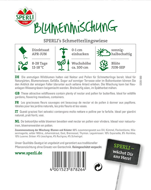 Mit der Blumenmischung „SPERLI’s Schmetterlingswiese“ erhältst du einen üppigen, farbenprächtigen Flor, der Schmetterlinge und andere Insekten anzieht. Die bis zu 100 cm hohen Blumen bieten den Nützlingen Nahrung und sichern somit das Überleben. Die Mischung besteht aus einer Auswahl an Wildblumen, die wunderschön von Juni bis September im Garten oder im Blumenkasten blühen. Einem üppigen Sommerblumenflor mit Schwerpunkt im Herbst (der Hauptschmetterlingszeit) im ersten Jahr folgt im nächsten Jahr ein gänzlich anderes Bild mit Stauden, denn diese Mischung besteht sowohl aus ein- als auch aus mehrjährigen Pflanzen.