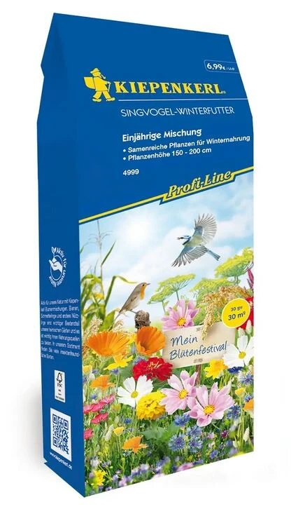 Helfen Sie den überwinternden Singvögeln auf ganz natürliche Art und nutzen Sie freie Reihen in Blumenbeeten, entlang vor Zäunen und Mauern oder freie Gemüsebeete für die Anzucht der Profi-Line-Blumenmischung „Singvogel-Winterfutter“ von Kiepenkerl! Die im Sommer herrlich blühende Mischung enthält eine Vielzahl spezieller Pflanzen wie Sonnenblumen und Gräser, welche ab Herbst ein reiches Angebot schmackhafter Körner bereithalten. Auf diese Weise bietet die Mischung in der kalten Jahreszeit den hungrigen Vögeln einen reich gedeckten Tisch.