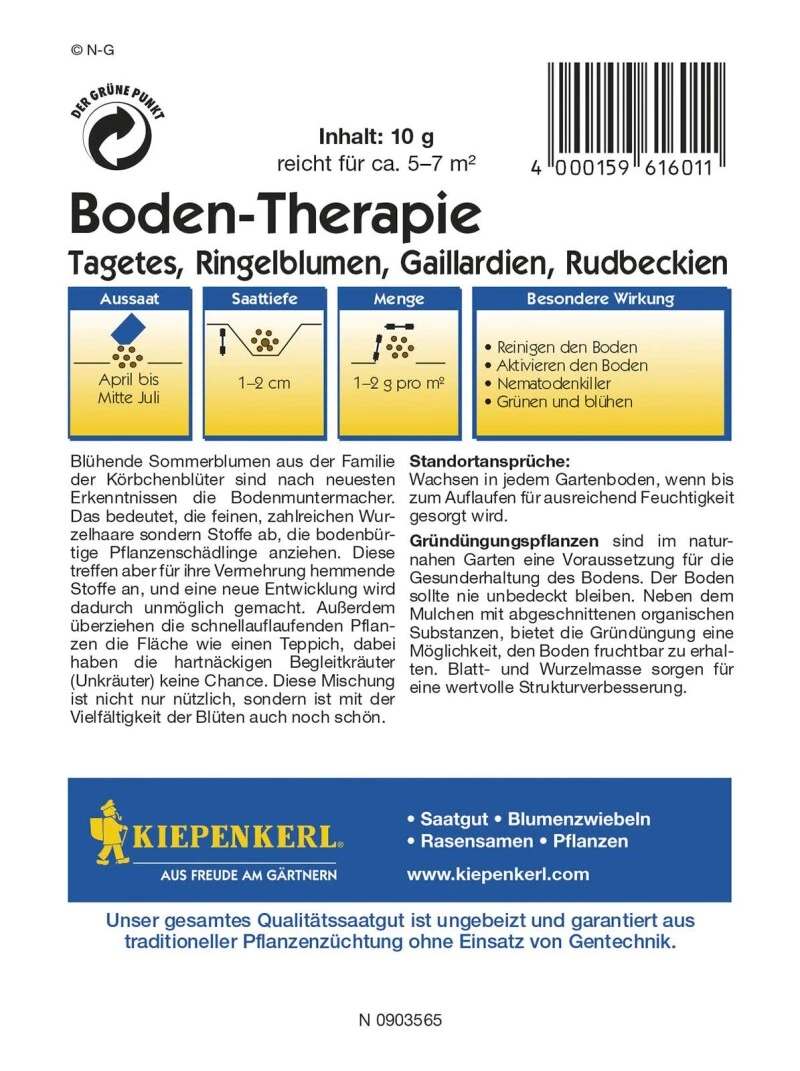 Boden-Therapie enthält folgende nicht winterharten Gründüngungspflanzen: Tagetes/ Studentenblume, Ringelblumen, Gaillardien, Rudbeckien Blühende Sommerblumen aus der Familie der Körbchenblüter sind nach neuesten Erkenntnissen die Bodenmuntermacher. Das bedeutet, die feinen, zahlreichen Wurzelhaare sondern Stoffe ab, die bodenbürtige Pflanzenschädlinge anziehen. Diese treffen aber für ihre Vermehrung hemmende Stoffe an und eine neue Entwicklung wird dadurch unmöglich gemacht. Außerdem überziehen die schnellauflaufenden Pflanzen die Fläche wie einen Teppich, dabei haben die hartnäckigen Begleitkräuter (Unkräuter) keine Chance. Diese Mischung ist nützlich und mit der Vielfältigkeit der Blüten sehr schön.