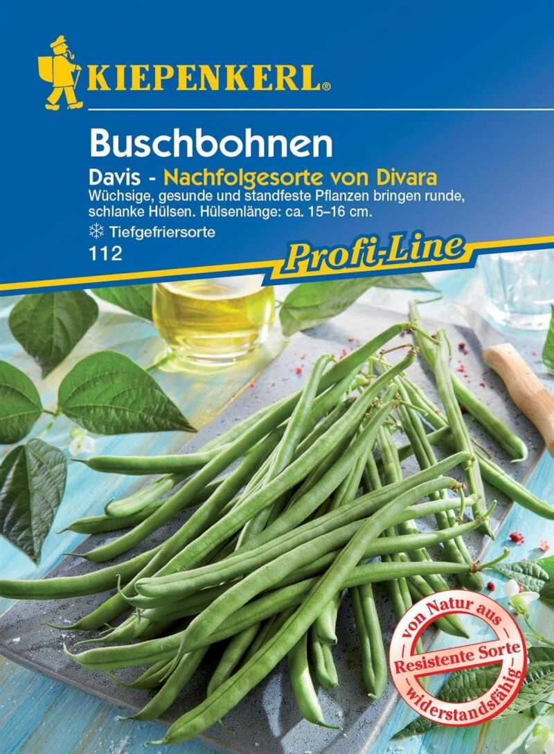 Die runden, schlanken Hülsen der ertragreichen Sorte ‚Davis‘ haben eine dunkelgrüne Färbung und werden 15 – 16 cm lang. Buschbohnen sind nach einem kurzen Kochprozess ein beliebtes Gemüse für die traditionelle Küche.
