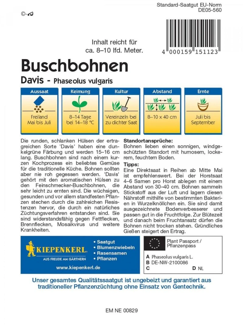 Bohnen sollten aber nie roh gegessen werden. ‚Davis‘ gehört mit den aromatischen Hülsen zu den Feinschmecker-Buschbohnen, die sehr leicht zu ernten sind.