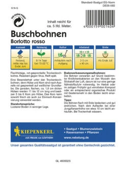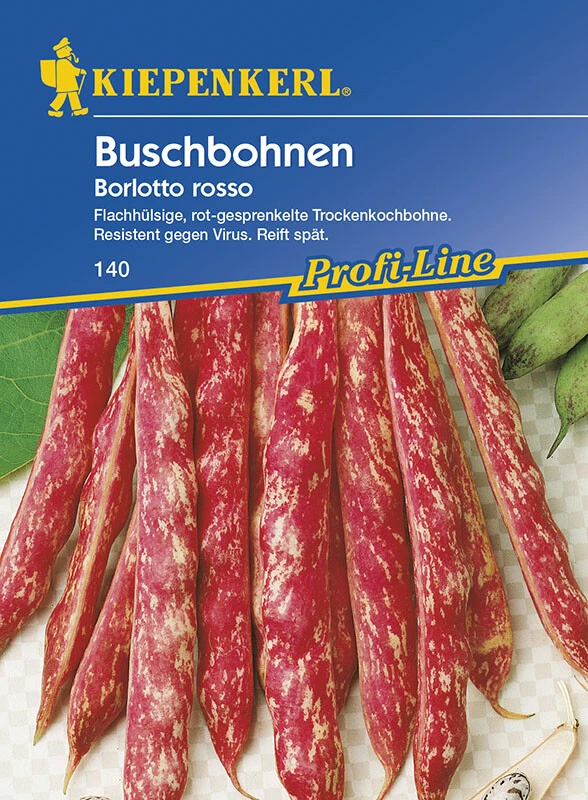 Als eine Besonderheit unter den Trockenkochbohnen ist die Buschbohne ‚Borlotto Rosso‘ bekannt. Ihre Hülsen und das Korn sind nach der Ausreife außergewöhnlich rot gesprenkelt auf weißlicher Grundfarbe. Sie sind gerade, flach und werden etwa 1,6 cm dick sowie 11 bis 12 cm lang. Pro Hülse können Sie mit 5 bis 6 Körnern rechnen. Die Sorte ist resistent gegen das Bohnenmosaikvirus und reift spät. Das aromatische Korn kann sowohl frisch als auch zur Einmach-Konservierung verwendet werden. Als Teil des Profi-Line-Sortiments von Kiepenkerl haben diese Buschbohnensamen eine herausragende Qualität.
