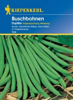 Die Buschbohne ‚Duplika‘ bildet runde, früh reifende Hülsen ohne Fäden in dunkelgrüner Farbe und mit weißem Korn. Sie bleiben an den Pflanzen lange knackig-frisch, sodass ab Juli die Ernte über einen langen Zeitraum möglich ist. Die als Hochbusch wachsenden Pflanzen sind von Natur aus resistent gegen Brennflecken, Fettflecken und das Bohnenmosaikvirus. In lockerer Erde gedeihen sie in sonniger Lage prächtig. Die Bohnen verwerten aufgrund von Knöllchenbakterien an den Wurzeln den Stickstoff aus der Luft, weshalb nur eine geringe Nährstoffzufuhr notwendig ist.