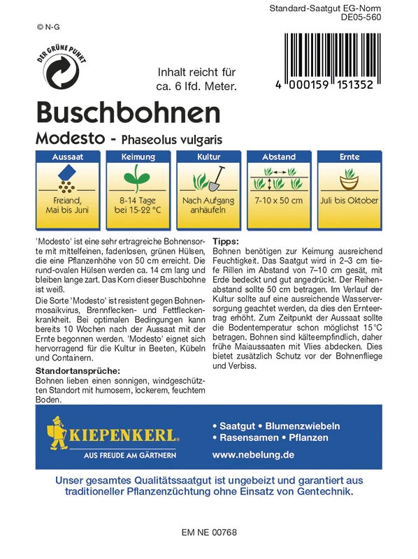 Die Buschbohne ‚Modesto‘ ist eine mittelfeine, sehr ertragreiche grüne Buschbohne. Liebhaber der Sorte ‚Dublette‘ können sich freuen, denn ‚Modesto‘ stellt ihre verbesserte Weiterentwicklung dar. Die rund-ovalen Hülsen werden ca. 13 bis 14 cm lang und bleiben fadenlos und lange zart. Das Korn dieser Buschbohne hebt sich in Weiß ab. Die Pflanzen erreichen eine Höhe von 50 cm. Besonders schön zeigt sich ihre hohe Standfestigkeit und Robustheit und Resistenz. So besitzen sie eine natürliche Widerstandskraft gegen das Bohnenmosaikvirus, die Brennflecken- und die Fettfleckenkrankheit. Zudem wächst ‚Modesto‘ ausgesprochen schnell. Bei optimalen Bedingungen können Sie bereits 10 Wochen nach der Aussaat mit der Ernte beginnen. Diese gesunde Buschbohne eignet sich hervorragend für die Kultur in Beeten, Kübeln und Gefäßen.