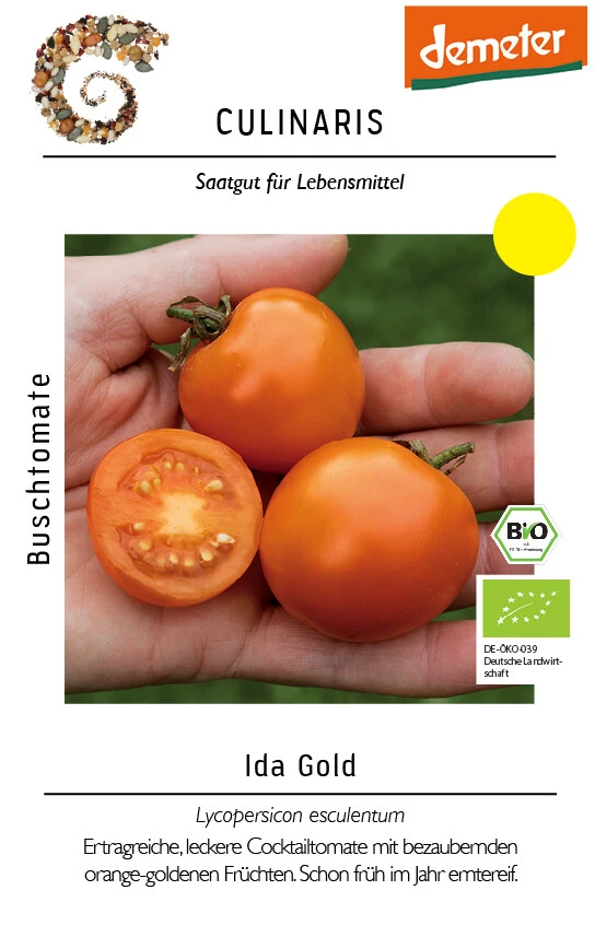 Ida Gold ist eine süße Cocktailtomate mit vielen orange-gold leuchtenden Früchten. Auch die frühe Beerntbarkeit macht den Anbau der Sorte reizvoll. Mit einem Fruchtgewicht von 30 g eignet sich Ida Gold besonders zum Frischverzehr. Unsere Buschtomaten sollten vor Regen geschützt werden und z.B. unter einem Dachüberstand stehen. Sie müssen nicht ausgegeizt oder hochgebunden werden, da sie determiniert wachsen. Der Anbau im Topf (mindestens 5 L Volumen) und auf dem Balkon ist sehr empfehlenswert.