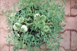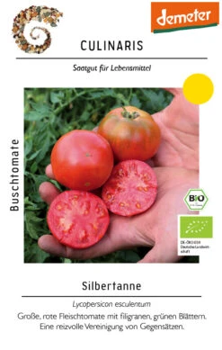 Die Fleischtomate Silbertanne hat große, rote, milde, saftige Früchte. Mit einem Fruchtgewicht von 120 g eignet sich Silbertanne besonders zum Kochen von Saucen, Mark und Suppen, aber auch zum Frischverzehr. Die grünen, filigranen Blätter stellen einen schönen Kontrast zu den großen Früchten dar. Unsere Buschtomaten sollten vor Regen geschützt werden und z.B. unter einem Dachüberstand stehen. Sie müssen nicht ausgegeizt oder hochgebunden werden, da sie determiniert wachsen. Der Anbau im Topf (mindestens 5 L Volumen) und auf dem Balkon ist sehr empfehlenswert.