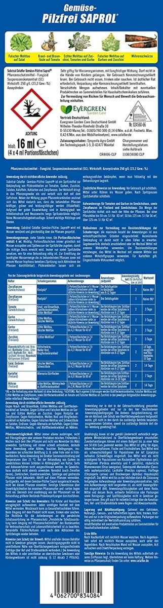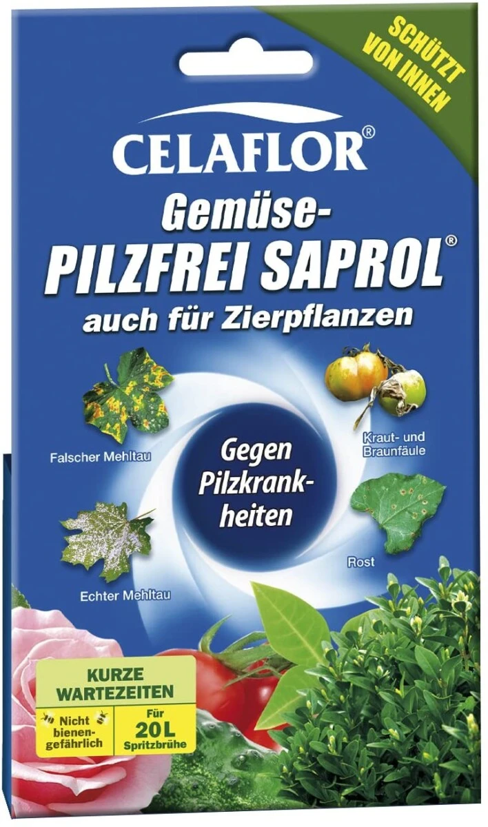 Celaflor Gemüse-Pilzfrei Saprol ist ein Spritzmittel zur Bekämpfung von Pilzkrankheiten an Tomaten, Gurken, Zucchini, Kohlgemüse, Rosen und anderen Zierpflanzen. Der Wirkstoff dringt in das Pflanzengewebe ein und verteilt sich dort mit dem Saftstrom. Neben der Wirkung gegen Pflanzenkrankheiten zeichnet sich Celaflor Gemüse-Pilzfrei Saprol dadurch aus, dass die behandelten Pflanzen kräftiger, grüner und leistungsfähiger werden (Vitaleffekt).Wirksam gegen Kraut- und Braunfäule, Echten Mehltau und Samtfleckenkrankheit an Tomaten. Gegen Echten und Falschen Mehltau an Gurken und Echten Mehltau an Zucchini, gegen Rost und Laubkrankheit an Spargel und gegen Rostpilze an Zierpflanzen.
