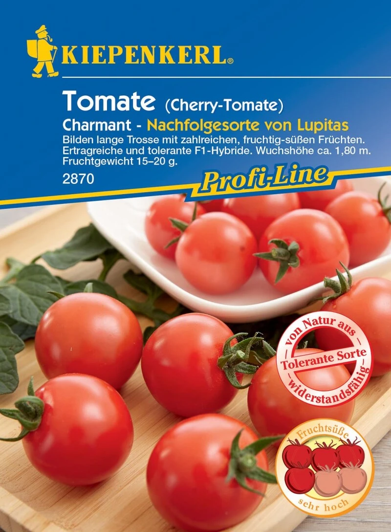 Die Profi-Line-Cherry-Tomate ‚Charmant, F1‘ ist die Nachfolgesorte von ‚Lupitas‘. Die Pflanze bildet lange Trosse mit zahlreichen, fruchtig-süßen Früchten. Die 15-20 g schweren Tomaten sind ideal geeignet, um sie als Snack zu genießen oder zum Einlegen oder Trocknen zu nutzen. Die F1-Hybride ist tolerant gegen Kraut- und Braunfäule und dabei besonders widerstandsfähig. An einem sonnigen Standort erreicht diese Sorte eine Wuchshöhe von ca. 180 cm. Die ertragreiche ‚Charmant, F1‘ kann im Freiland z.B. in großen Kübeln oder im Gewächshaus kultiviert werden.