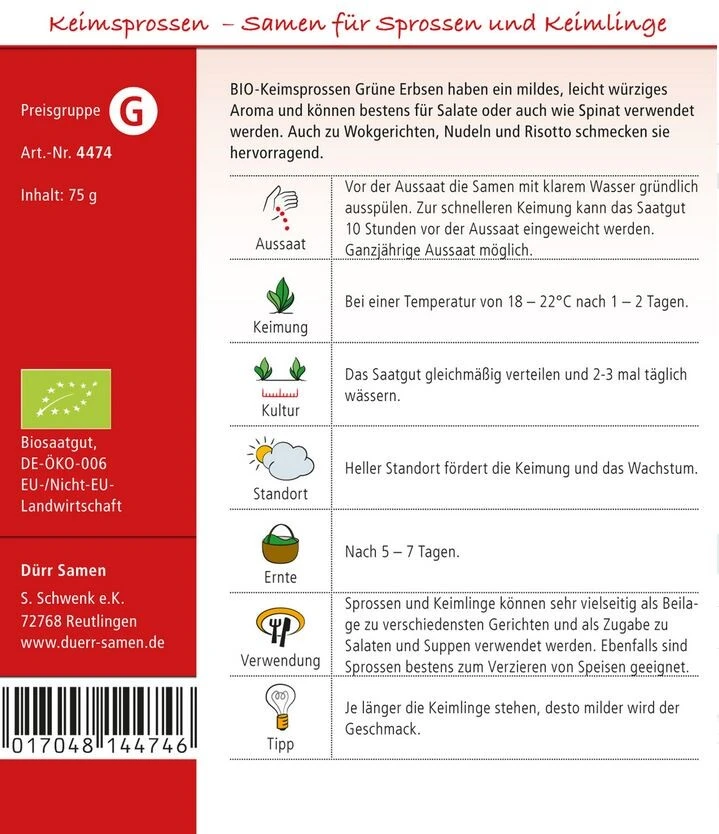 BIO-Keimsprossen Grüne Erbsen haben ein mildes, leicht würziges Aroma und können bestens für Salate oder auch wie Spinat verwendet werden.