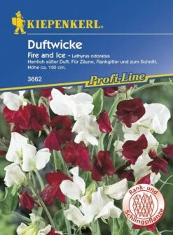 Tiefrote und weiße Blüten mit süßem Wickenduft bilden ein attraktives Duett an Zäunen, Gittern oder als Schnittblume in der Vase.