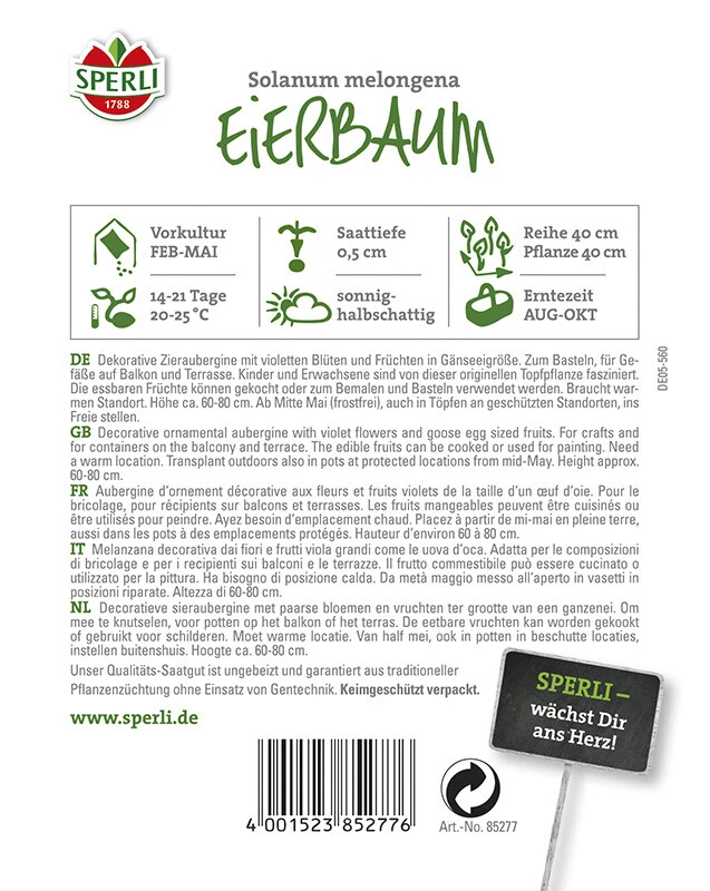 Du hast noch einen Platz im Wintergarten, auf der Fensterbank oder auf dem Balkon bzw. der Terrasse frei? Der Eierbaum von SPERLI kann diese Lücke auf besonders imposante Art und Weise füllen! Die dekorative Zieraubergine bringt nicht nur schöne violette Blüten hervor, sondern auch Früchte in der Größe eines Gänseeis. Sie sind essbar und können gekocht oder zum Basteln und Bemalen verwendet werden. Der Eierbaum ist eine einjährige Pflanze, die einen warmen, geschützten Standort braucht. Er wird ca. 60 bis 80 cm hoch und kann von August bis Oktober beerntet werden.