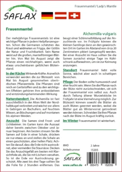 Pflege: Der Boden sollte humusreich und eher feucht sein. Wenn Sie die Pflanze nach der Blüte nicht zurückschneiden, sät sich der Frauenmantel von selbst aus. Auch durch Teilung älterer Wurzelstöcke im Frühjahr ist eine Vermehrung möglich. Zur Blütezeit können sowohl die Blätter als auch Blüten geerntet werden, wobei die Blätter gut als Wintervorrat getrocknet werden können. Schneiden Sie Ihre Pflanze nach der Blüte im August kräftig zurück.