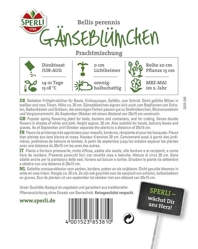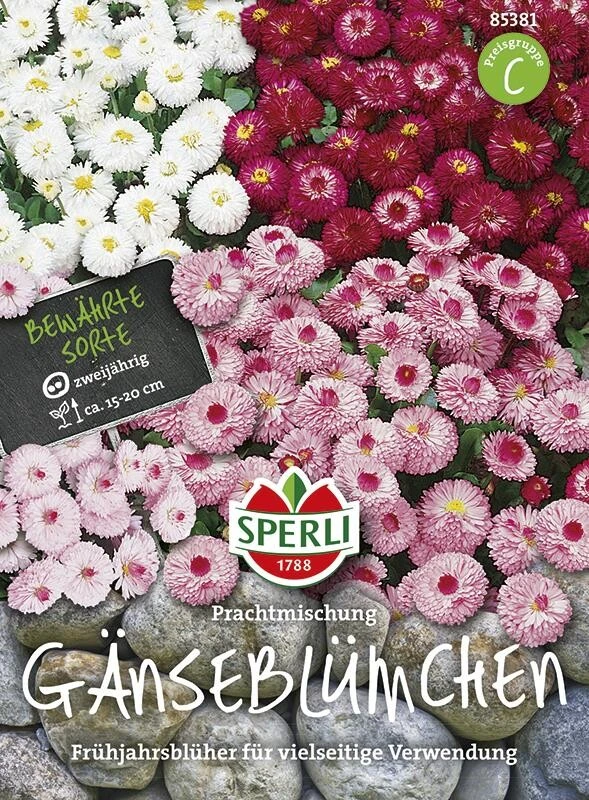 Diese Mischung enthält verschiedenfarbige, zweijährige, niedrig bleibende Frühlingsblumen. Das robuste Gänseblümchen eignet sich hervorragend für Rabatten, Einfassungen, schalen und Kübel, kleine Sträuße oder zum Verwildern in Blumenwiesen.