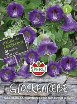 Die Glockenrebe ‚Violette Schönheit‘ ist eine wüchsige Kletterpflanze, die Dich von August bis November mit zahlreichen violetten Blüten begeistern wird. Für Spaliere, Zäune, Mauern, Terrassen oder Balkone ist sie bestens geeignet. Die einjährigen, 2 bis 3 m hoch wachsenden Pflanzen benötigen eine Vorkultur in Töpfen und nach dem Auspflanzen ab Mitte Mai ein stabiles Rankgerüst. Da die Blüten sehr haltbar sind, kannst Du die Glockenrebe auch für den Vasenschnitt verwenden.