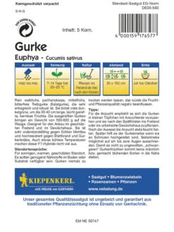 Bei der Salatgurke ‚Euphya, F1‘ handelt es sich um eine rein weibliche und parthenokarpe Pflanze, was bedeutet, dass sie auch ohne erfolgte Befruchtung viele Früchte hervorbringt. Diese Treibgurke zählt zu den mittelfrühen Sorten und ist äußerst robust. So ist sie sehr widerstandsfähig gegen Echten Mehltau und hochresistent gegen Blattbrand und Gurkenkrätze. Die köstlichen bitterfreien Gurken haben eine dunkelgrüne und leicht geriefte Schale. Zwischen 30 cm und 40 cm werden die kernlosen Früchte lang und bringen außerdem ein Gewicht von 500 g bis 600 g auf die Waage. Die Salatgurke ‚Euphya, F1‘ ist für den Anbau im geschützten Freiland und im Gewächshaus geeignet. Auch etwas kühlere Temperaturen machen dieser F1-Hybride nicht viel aus.