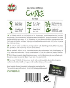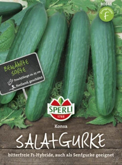 Die Salatgurke ‚Konsa‘ ist eine ertragreiche und frühe Freilandgurke mit sehr hochwertigen, 25 cm langen Früchten. Diese sind glatt, dunkelgrün, glänzend, mit kleinem Kerngehäuse und bitterstofffrei. Ausgereift lassen sie sich auch als Senfgurke verarbeiten. Die Aussaat kann ab April als Vorkultur und ab Mai als Direktsaat erfolgen. Von Juni bis August können die schmackhaften Gurken geerntet werden.