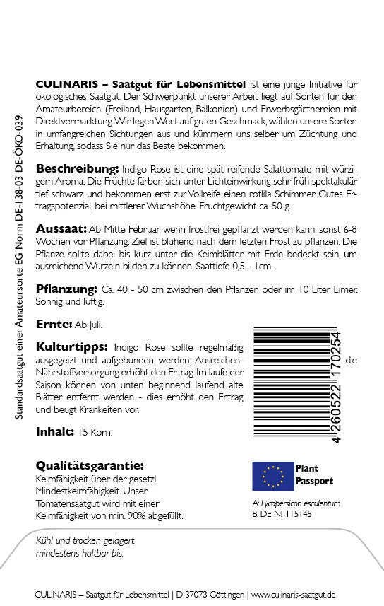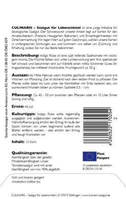 Indigo Rose ist eine spät reifende Salattomate mit einem würzigen Aroma. Sie hat ein Fruchtgewicht von 50 g und eignet sich als Blickfang in Salaten, zum Direktverzehr oder um Gemüsegerichten eine besondere Note zu verleihen. Die Früchte färben sich unter Lichteinwirkung sehr früh spektakulär schwarz und bekommen erst zur Vollreife einen rot lila Schimmer. Sie haben einen sehr hohen Anthocyan-Gehalt. Trotz der späten Fruchtreife hat Indigo Rose ein gutes Ertragspotenzial. Die Pflanze ist von mittlerer Wuchshöhe. Sehr hohe Temperaturen sollten vermieden werden. Indigo Rose sollte geschützt unter einem Dachüberstand oder im Gewächshaus angebaut werden. Sie sollte regelmäßig ausgegeizt und aufgebunden werden. Eine ausreichende Nährstoffversorgung erhöht den Ertrag.