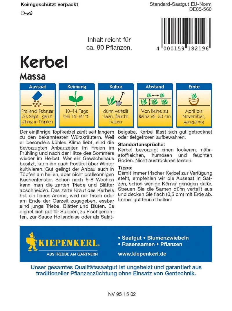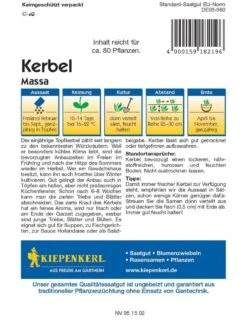 Der Kerbel ‚Massa‘ ist ein schnellwüchsiges Küchenkraut mit angenehm würzigem Aroma, das an Anis erinnert. Es eignet sich gut für Suppen, Fischgerichte, Sauce Hollandaise oder als Salatbeigabe. Die einjährige Profi-Line-Sorte von Kiepenkerl ist für das Freiland und Gewächshaus geeignet. Weil Kerbel besonders kühles Klima liebt, sollte er am bestens entweder im Frühling oder im Herbst angebaut werden. Im Gewächshaus ist auch eine Kultur über den Winter hinweg möglich. Nach der Aussaat dauert es nur 6 bis 8 Wochen, bis die ersten zarten Triebe und Blätter geerntet werden können. Im Freiland ist die Ernte von April bis November und im Gewächshaus ganzjährig möglich.