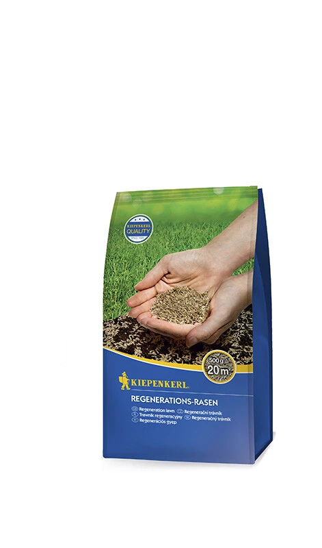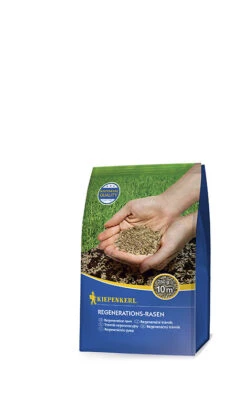 Der Kiepenkerl Regenerations-Rasen ist eine spezielle Rasenmischung zur Ausbesserung schadhafter Rasenstellen, der eine hohe Regenerationsfähigkeit aufweist. Lücken und Rasenschäden können zum Beispiel durch Wühlmäuse, Engerlinge, Maulwürfe, Rasenkrankheiten oder zu starke Belastungen entstehen. Nach dem Vertikutieren wird die Rasenmischung flächig auf die Lücken aufgebracht. Der Boden sollte dafür unkrautfrei, gelockert und rückverfestigt sein. Da die Rasensamen schnell keimen, wächst nur wenige Wochen nach der Aussaat an den ausgebesserten Stellen ein gesunder, strapazierfähiger und widerstandsfähiger Rasen. Freuen Sie sich auf eine konkurrenzstarke, verdichtete Rasenfläche! Schon 0,25 kg reichen für eine Rasenfläche von insgesamt 10 m².
