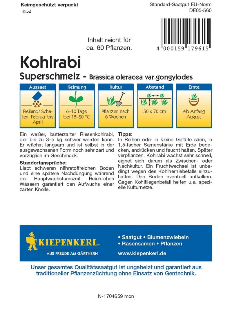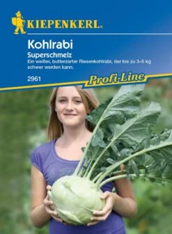 Butterweich zergeht Ihnen der Kohlrabi ‚Superschmelz‘ auf der Zunge. Der weiße Profi-Line Riesenkohlrabi wächst eher langsam, aber bringt dafür bei seiner Ernte im August 3-5 kg auf die Waage. Der schmackhafte Kohl eignet sich gut zur Zwischen- oder Nachkultur im Beet und wird durch reichliches Wässern umso zarter.