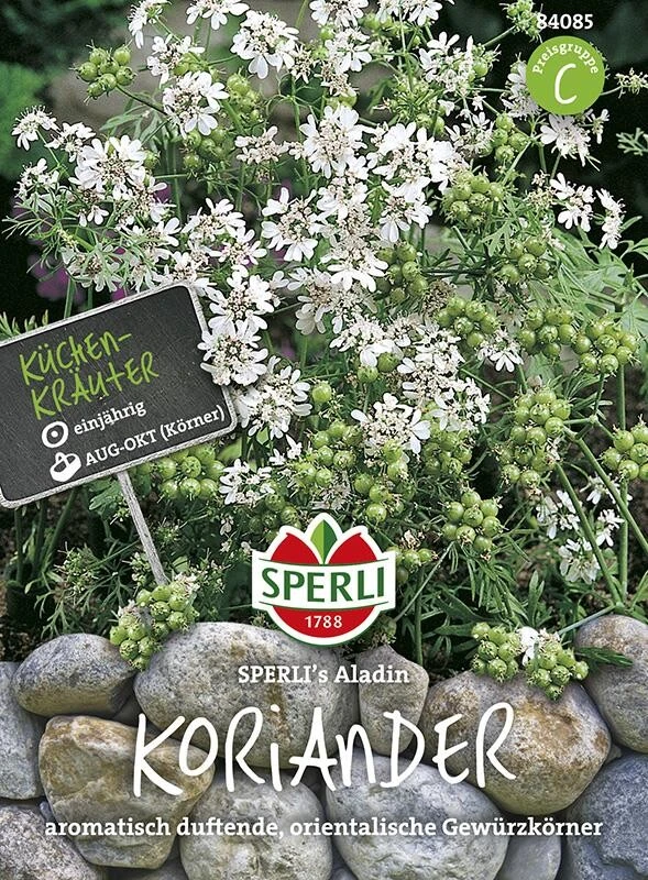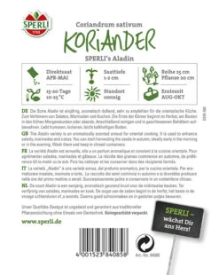 Der Koriander ‚SPERLI’s Aladin‘ ist ein einjähriges, sehr aromatisch duftendes Würzkraut, welches besonders für die orientalische Küche sehr zu empfehlen ist. Zum Verfeinern von Salaten, Marinaden und Kuchen ist es beispielsweise wunderbar geeignet. Nach der Aussaat im April oder Mai an sonniger Stelle und in humoser, lockerer, leicht kalkhaltiger Erde kann die Ernte der Körner im Zeitraum von August bis Oktober erfolgen. Vor allem die Morgen- und Abendstunden bieten sich dafür an. An schließend werden die Körner gereinigt und in geschlossenen Behältern bis zur Verwendung aufbewahrt.