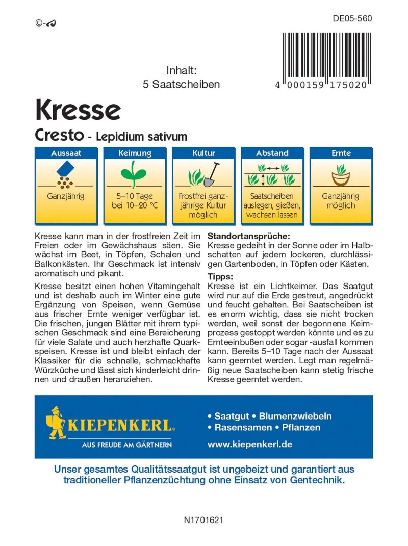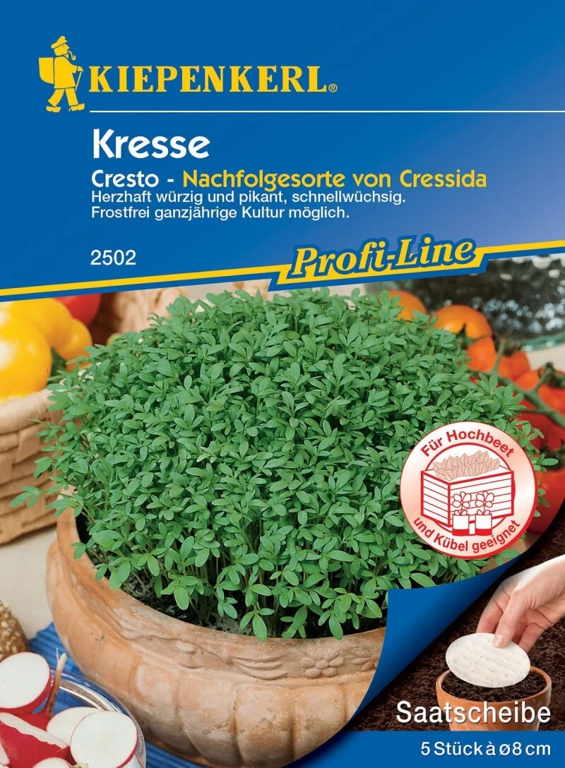 Die Kresse ‚Cresto‘ aus dem Kiepenkerl Profi-Line-Programm kann in der frostfreien Zeit im Freien oder im Gewächshaus ganz einfach per Saatscheibe ausgesät werden. Sie wächst im Beet oder Hochbeet sowie in Töpfen, Schalen und Balkonkästen. Ihr Geschmack ist intensiv aromatisch und pikant. Kresse besitzt einen hohen Vitamingehalt und ist deshalb auch im Winter eine gute Ergänzung, wenn Gemüse aus frischer Ernte weniger verfügbar ist. Die frischen, jungen Blätter mit ihrem typischen Geschmack sind eine Bereicherung für viele Salate und auch herzhafte Quarkspeisen. Kresse ist und bleibt einfach der Klassiker für die schnelle, schmackhafte Würzküche und lässt sich kinderleicht drinnen und draußen heranziehen.