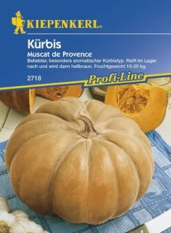 Der traditionsreiche Kürbis ‚Muscat de Provence‘ ist ein beliebter, flachrunder, stark gerippter Muskat-Kürbis. Er wird 10 bis 20 kg schwer und besitzt einen Durchmesser von etwa 30 bis 40 cm. Diese wärmeliebende, südfranzösische Sorte hat eine lange Reifezeit. Geerntet werden sollten die Früchte erst im Herbst, wenn sie anfangen sich von Dunkelgrün nach Hellbraun umzufärben. Im Lager reifen sie dann noch gut nach und werden schließlich ganz hellbraun. Das aromatische Fleisch der Profi-Line-Sorte ist kräftig orangerot gefärbt und von fester Konsistenz. Die Pflanzen wachsen kräftig mit langen Trieben und tragen viele Früchte.