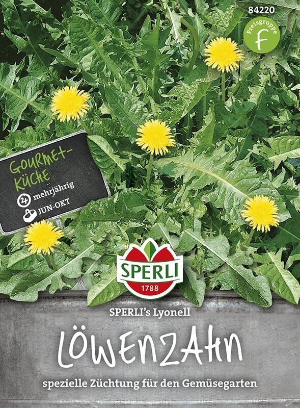 Bei dem Löwenzahn ‚SPERLI’s Lyonell‘ handelt es sich um eine spezielle Züchtung für den Gemüse- und Kräutergarten. Sie ist mehrjährig und kann in Vorkultur von März bis April und per Direktsaat von Mai bis September ausgesät werden. Die länglichen, gezahnten Blätter wachsen zuerst, schmecken bitter-aromatisch und können für Salate verwendet werden. Im Herbst können die kräftigen, verzweigten Wurzeln ausgegraben und in einem Eimer neu gepflanzt werden. Dieser wird dann für die Treiberei mit Folie bedeckt und warm gehalten. Aus dem hellen, zarten Austrieb lassen sich ebenfalls schmackhafte Salate herstellen. Auch die intensiv gelben Blüten des Löwenzahns sind verwendbar, etwa für Löwenzahnblütentee oder Löwenzahnhonig.