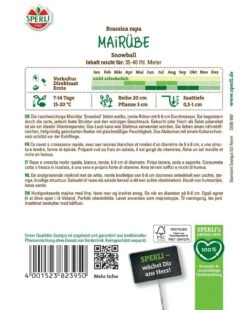 Die Mairübe ‚Snowball‘ ist eine ertragreiche, raschwüchsige Rübensorte. Die weißen, kugelrunden Früchte haben ein zartes, festes Fleisch und einen würzigen, feinen, leicht süßen Geschmack. Sie erreichen im Durchmesser ca. 6 bis 8 cm und sind roh, gekocht oder gedünstet eine hervorragende Beilage zu Fleisch- und Fischgerichten. Das Kraut wiederum liefert als Stielmus die Grundlage für Eintöpfe oder kann als Gemüse, Salat oder ähnlich wie Spinat zubereitet werden. Wird ‚Snowball‘ im April oder Mai ausgesät, kann die Ernte bereits im Juni erfolgen. Bei einer Aussaat im Juli oder August fällt die Erntezeit auf September und Oktober. Für eine erfolgreiche Kultur sind ein sonniger bis halbschattiger Standort sowie ein lockerer und humoser Boden ideal.