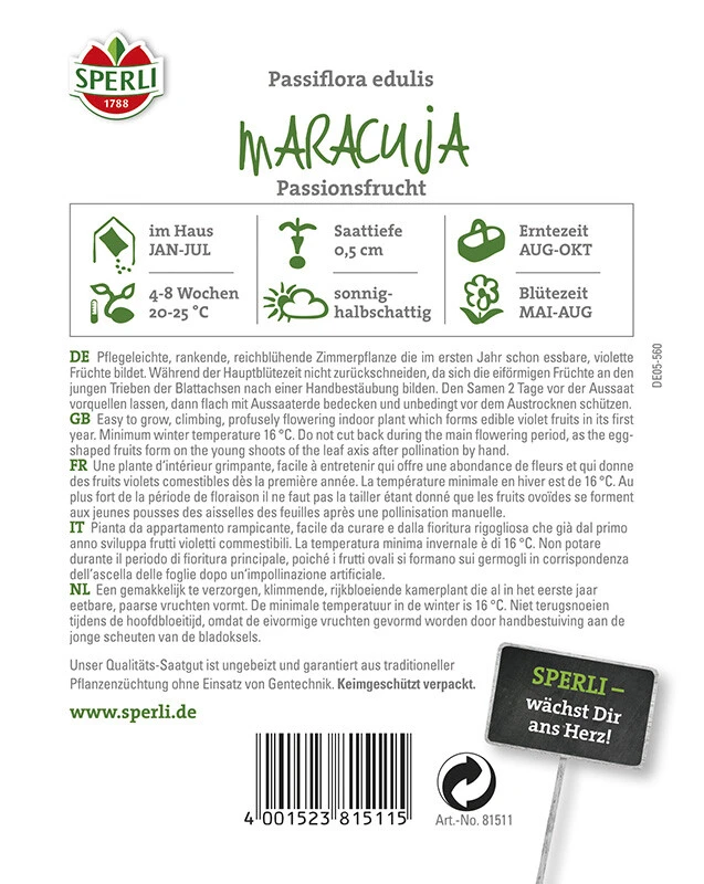 Die Maracuja, auch als Passionsfrucht bekannt, ist eine üppig blühende Zimmer- und Kübelpflanze mit hohem Zierwert. Doch nicht nur das: Diese Rarität bildet in den Blattachsen schon im ersten Jahr violette, eiförmige Früchte, die essbar sind. Dafür darf die Pflanze während der Blütezeit allerdings nicht zurückgeschnitten werden und die Bestäubung muss per Hand erfolgen. In der Zeit von Januar bis Juli können die Samen ausgebracht werden. Sie sollten vor der Aussaat zwei Tage quellen und nach der Saat nur flach mit Erde bedeckt werden. Vor dem Austrocknen sind die so ausgesäten Samen unbedingt zu schützen, damit sich – je nach Aussaatzeitpunkt – von Mai bis August zuverlässig Blüten und schließlich auch die Früchte bilden.
