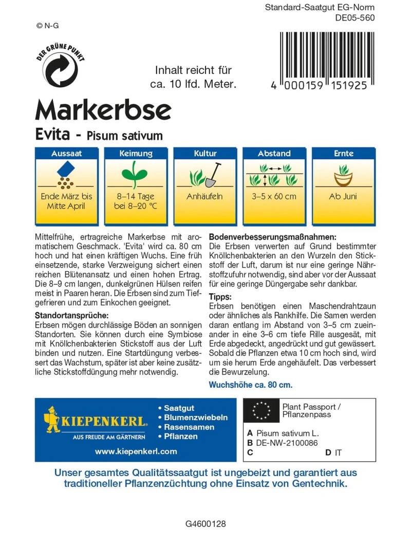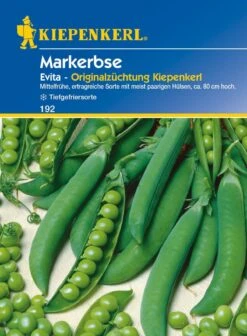 Die mittelfrühe Markerbse ‚Evita‘ ist eine Sorte mit aromatischem Geschmack, dunklem Laub und kräftigem Wuchs. Die Pflanzen werden ca. 80 cm hoch und sind dicht besetzt mit paarig heranreifenden, 8 bis 9 cm langen Hülsen. Sie glänzen in attraktivem Dunkel- bis Mittelgrün. Schon früh setzt von unten eine starke Verzweigung ein, die einen reichen Blütenansatz und hohen Ertrag mit sich bringt. Das Korn ist mittelgroß, mittelgrün und zart feinschalig. Die Erbsen sind zum Tiefgefrieren und Einkochen geeignet und behalten dabei ihren angenehmen Geschmack. Bei ‚Evita‘ handelt es sich um eine Originalzüchtung Kiepenkerls.
