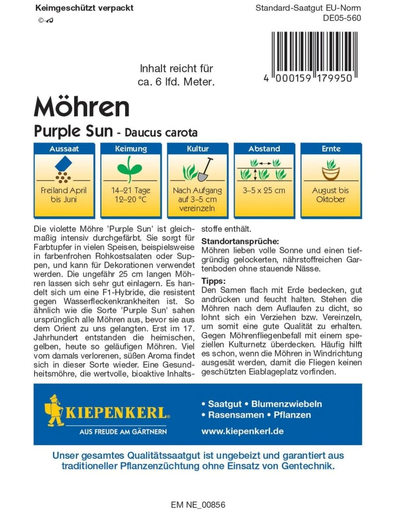 Den Samen flach mit Erde bedecken, gut andrücken und feucht halten. Stehen die Möhren nach dem Auflaufen zu dicht, so lohnt sich ein Verziehen bzw. Vereinzeln, um somit eine gute Qualität zu erhalten.
